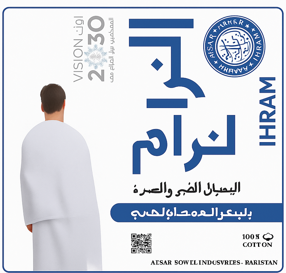 Our Ihram is manufactured by Afsar Towel Industries – Pakistan, trusted for high-quality cotton products worldwide. Designed with Saudi Vision 2030 standards, Ihram for Hajj & Umrah 100% Cotton / Antibacterial